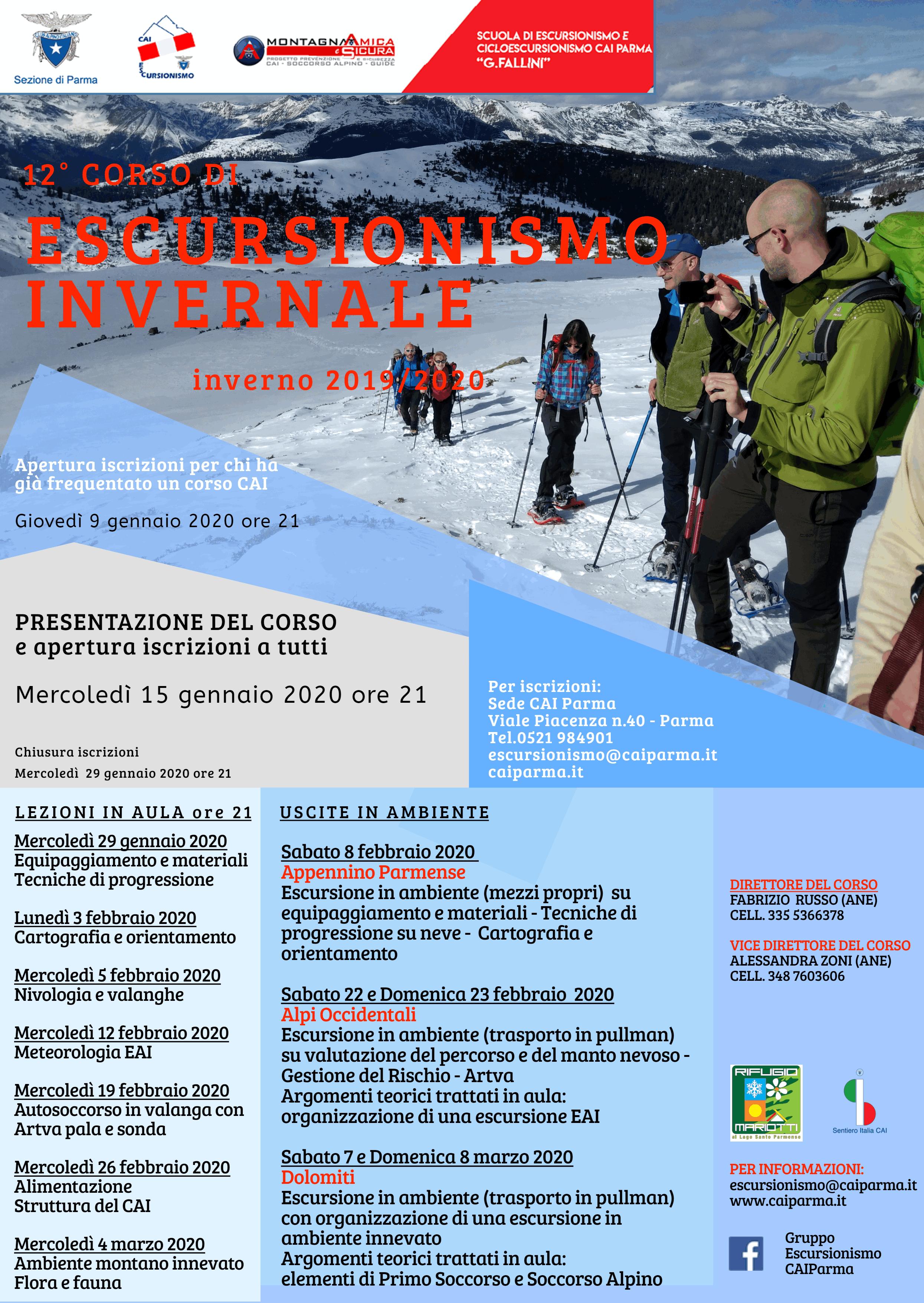 Presentazione del Corso e apertura iscrizioni per tutti presso la sede del Cai di Parma, mercoledì 15 gennaio 2020 alle ore 21 (dalle 20 apertura prenotazioni). Per gli ex-corsisti l'apertura è anticipata a giovedì 9 gennaio 2020.