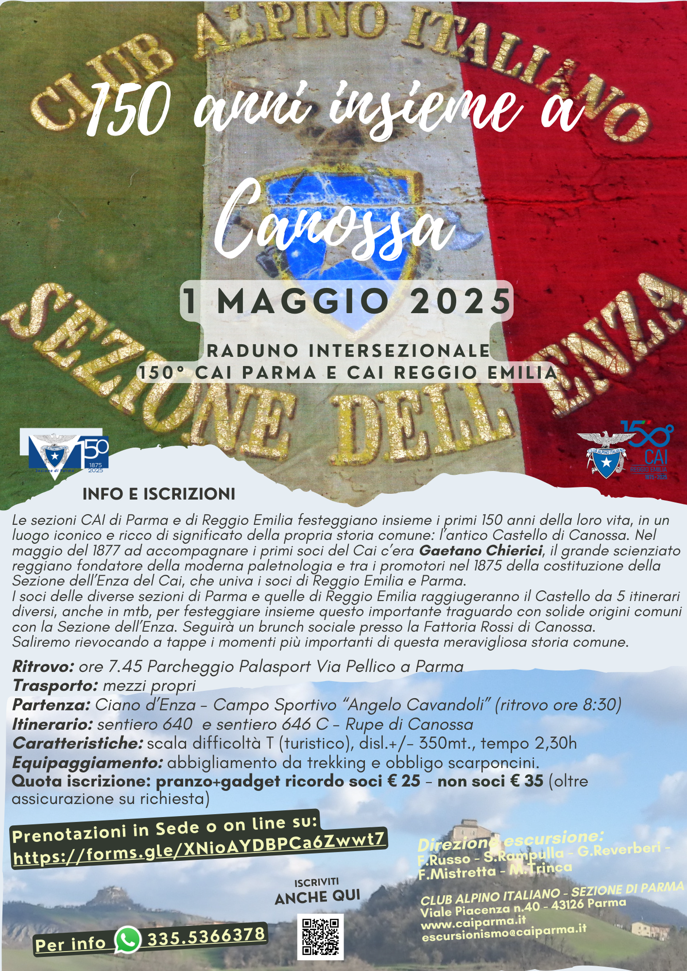 I soci delle diverse sezioni di Parma e quelle di Reggio Emilia raggiugeranno il Castello da 5 itinerari diversi, anche in mtb, per festeggiare insieme questo importante traguardo con solide origini comuni con la Sezione dell’Enza. Seguirà un brunch sociale presso la Fattoria Rossi di Canossa. Saliremo rievocando a tappe i momenti più importanti di questa meravigliosa storia comune.