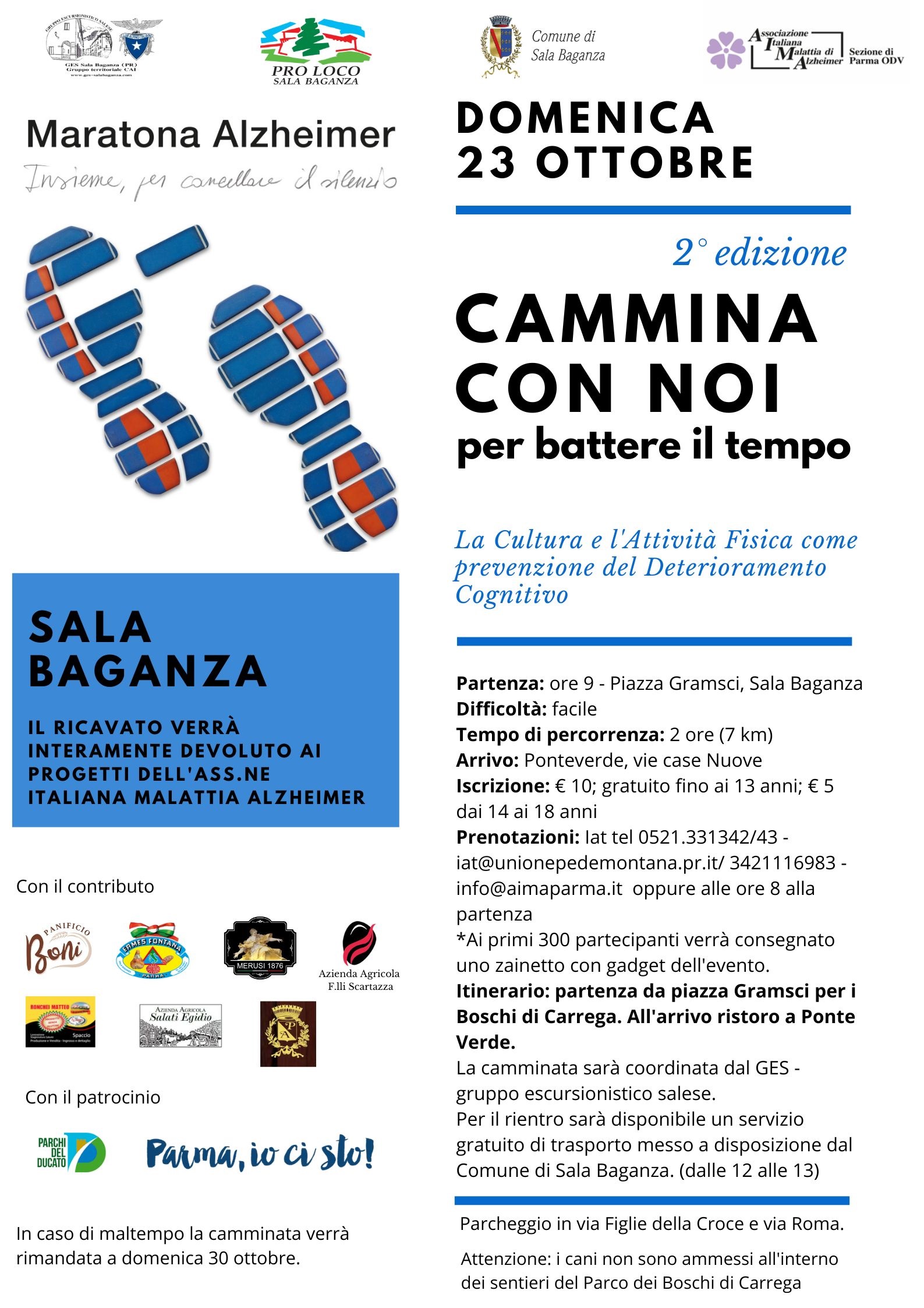 Il GES di Sala Baganza coordinerà la camminata di sensibilizzazione per promuovere l'attività fisica come prevenzione contro il deterioramento cognitivo: 7 km da Sala Baganza per i Boschi di Carrega con ristoro finale. Il ricavato verrà interamente devoluto all'Associazione Italiana Malattia Alzheimer. Tutti i dettagli nella locandina allegata.