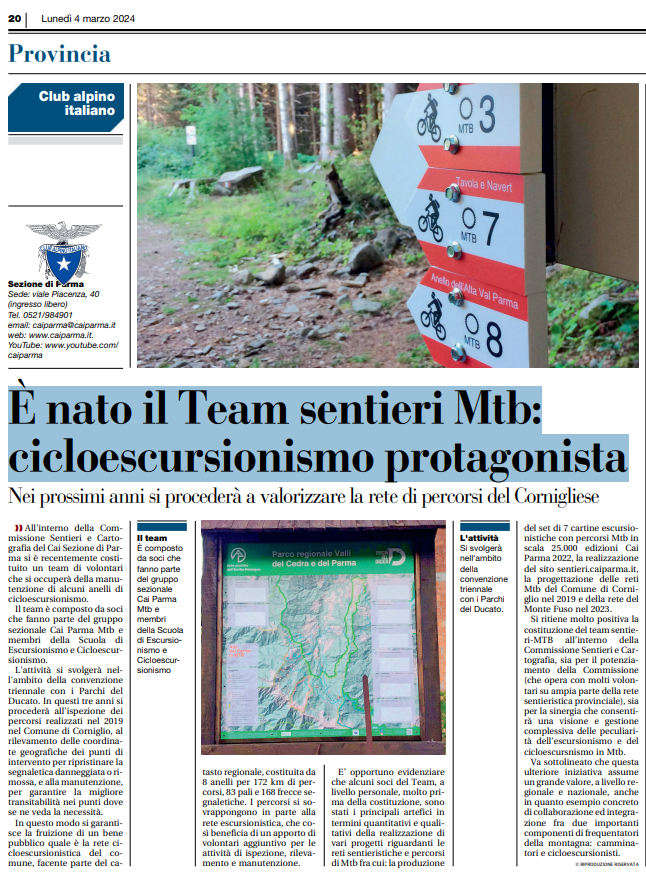 Prosegue, con una modalità ancora una volta innovativa, l'impegno della Sezione nella cura della rete sentieristica locale: è di questo inizio di anno la costituzione del "Team sentieri mtb": formato da un gruppo di volontari cicloescursionisti che si occuperà della manutenzione di alcuni anelli di cicloescursionismo. Il team è composto da soci che fanno parte del gruppo sezionale Cai Parma Mtb e membri della Scuola di Escursionismo e Cicloescursionismo. Tutti i dettagli nell'articolo allegato, pubblicato sulla Gazzetta di Parma del 4 marzo.