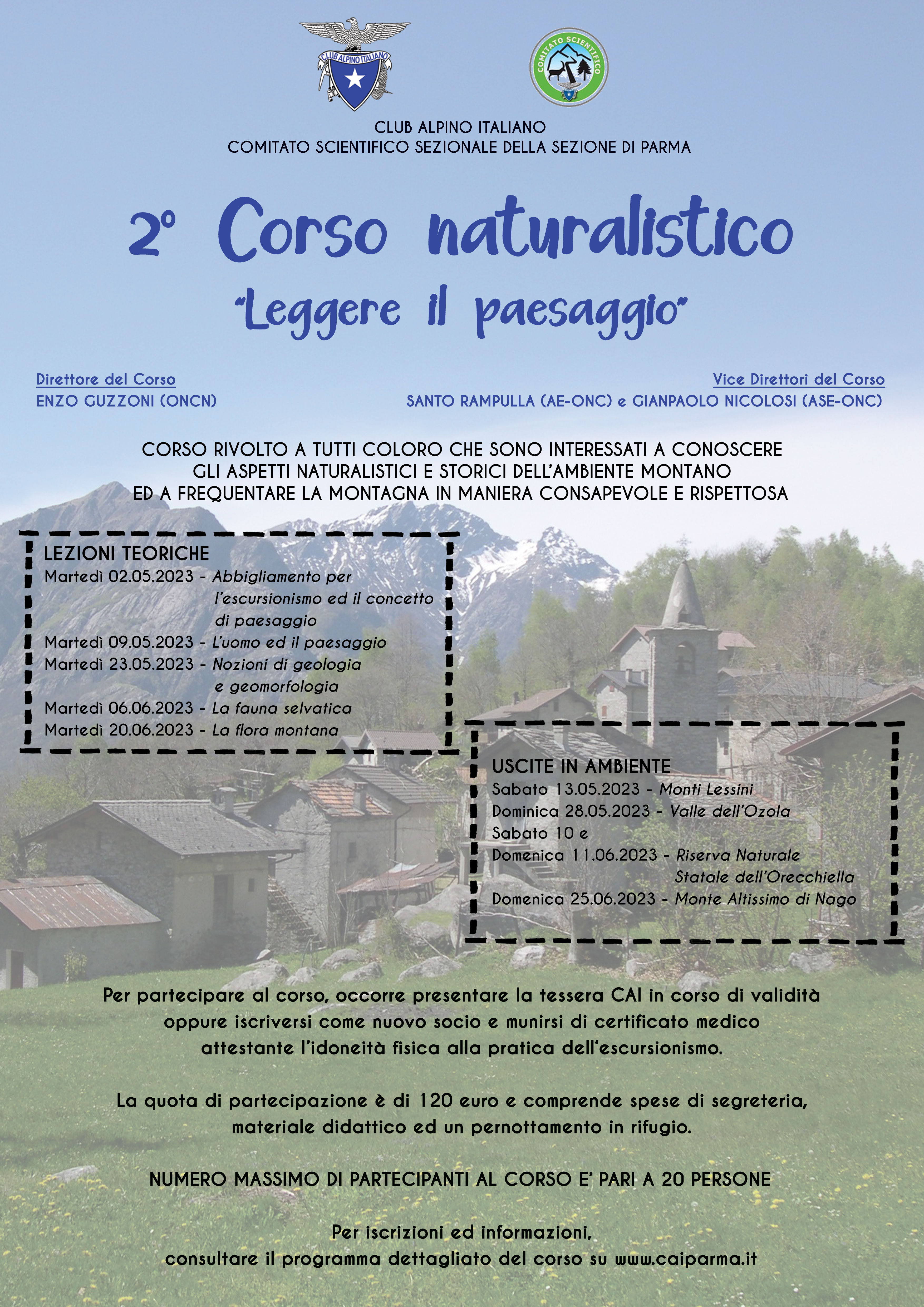 Sono aperte le iscrizioni alla seconda edizione del Corso naturalistico "Leggere il paesaggio". Il Corso è rivolto alle persone interessate a conoscere gli aspetti naturalistici e storici dell’ambiente montano ed a frequentare la montagna in maniera consapevole e rispettosa. Il Corso è strutturato in lezioni teoriche ed uscite in ambiente come da calendario. Le uscite in ambiente sono indicate in grassetto e sono previste su itinerari classificati come “T” ed “E”, secondo la scala delle difficoltà escursionistiche riconosciuta dal CAI. Per iscrizioni e programma tutte le informazioni nella locandina e nel programma che trovate in allegato.