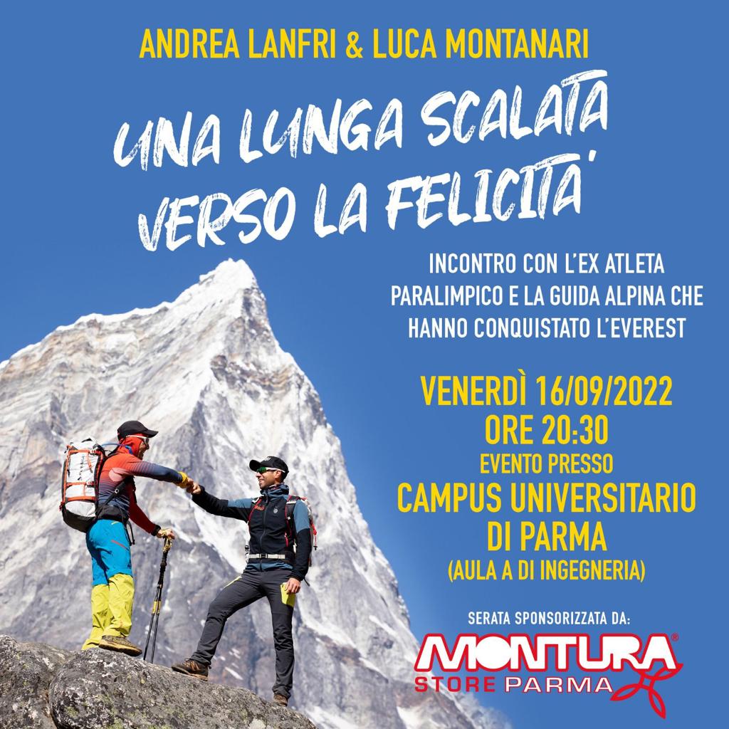Venerdì 16 Settembre ore 20:30 al Campus Universitario (Aula A Ingegneria) "Una lunga scalata verso la felicità" : Andrea Lanfri atleta paralimpico e la Guida Alpina Luca Montanari raccontano la loro recente avventura sull'Everest. La serata a ingresso libero è sponsorizzata dal Montura Store di Parma.