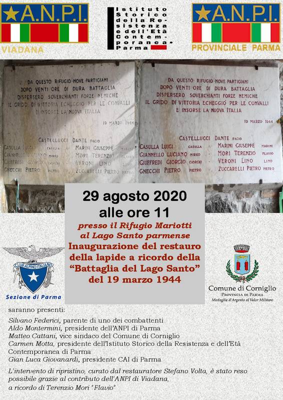 Sabato 29 agosto alle 11 è stato inaugurato, con una breve e toccante cerimonia nonostante il maltempo, il restauro e la pulizia della targa che, sul muro del Rifugio Mariotti, ricorda la battaglia del 19 marzo 1944 tra 9 partigiani, asserragliati nel rifugio, e soverchianti forze nazifasciste, che si concluse con pesanti perdite a carico degli assalitori. L'intervento di restauro, sostenuto dall'ANPI di Viadana, è stato effettuato a cura del restauratore Stefano Volta. Rappresentanti del Comune di Corniglio, ANPI di Parma con le Sottosezioni di Collecchio, Colorno e Salsomaggiore, ANPI di Viadana e di Pontremoli, ANPPIA di Parma, Provincia di Parma, Istituto Storico della Resistenza di Parma e CAI, alla presenza di una rappresentanza dei Carabinieri Forestali, hanno insieme ricordato l'evento. Era presente anche Adelmo Cervi, nipote di Alcide, "papà Cervi".