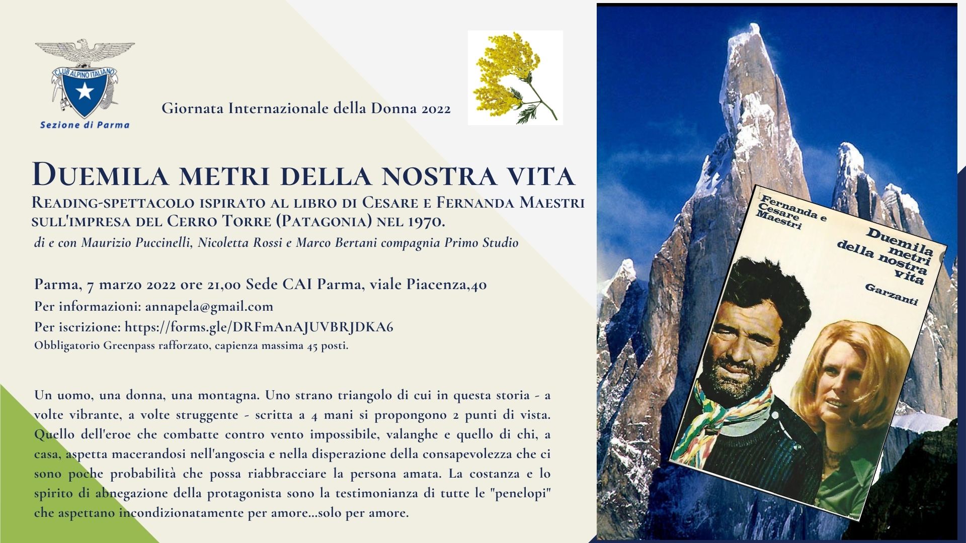 In occasione della Giornata Internazionale della Donna, lunedì 7 marzo 2022 ore 21,00 presso la Sede CAI Parma, viale Piacenza,40 reading-spettacolo "Duemila metri della nostra vita": ispirato al libro di Cesare e Fernanda Maestri sull'impresa del Cerro Torre (Patagonia) nel 1970; di e con Maurizio Puccinelli, Nicoletta Rossi e Marco Bertani compagnia Primo Studio.