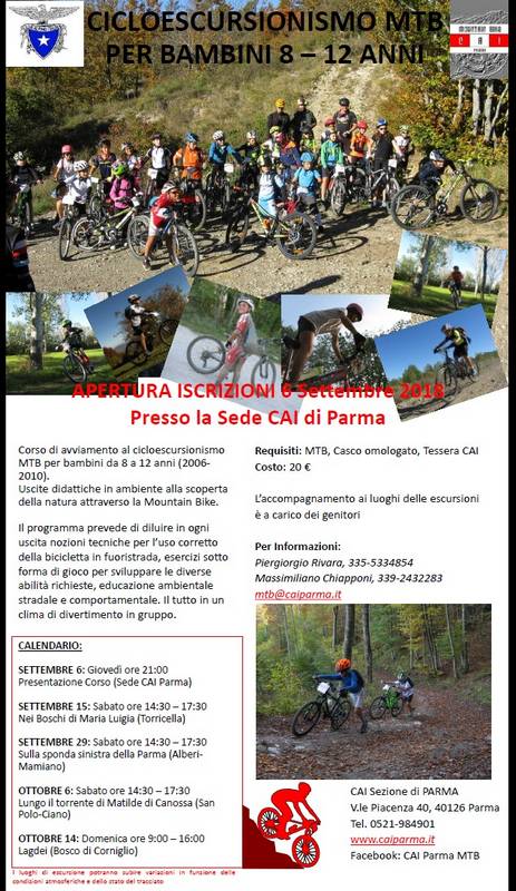 Avvisiamo i genitori dei ragazzi che hanno superato il limite di età per partecipare al corso che a breve pubblicheremo la data di una escursione in MTB dedicata agli ex-allievi ora adolescenti che si terrà presumibilmente in ottobre. Tenete d'occhio il sito www.caiparma.it e i social della sezione e del gruppo cicloescursionismo.
