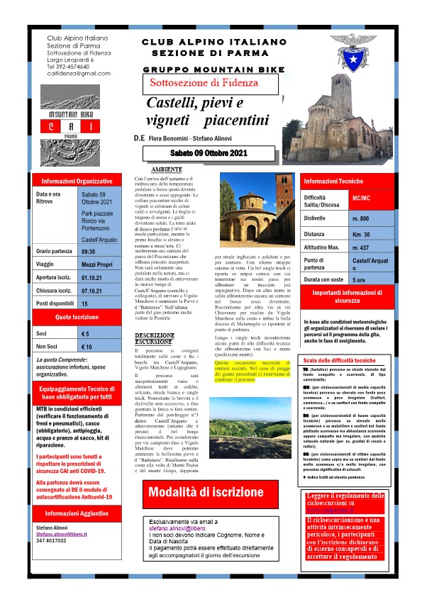 Con l’arrivo dell’autunno e il rinfrescarsi della temperatura pedalare a bassa quota diventa divertente e assai appagante. Le colline piacentine ricche di vigneti si colorano di colori caldi e avvolgenti. Le foglie si tingono di rosso e i gialli diventano saturi. La terra arata di fresco profuma l’aria in modo particolare, mentre le prime foschie si alzano e sostano a mezz’aria. Ci inoltreremo nei sentieri del parco del Piacenziano che offrono percorsi inaspettati. Non sarà solamente una pedalata nella natura, ma ci darà anche modo di attraversare lo storico borgo di Castell’Arquato (castello e collegiata), di arrivare a Vigolo Marchese e ammirare la Pieve e il “Battistero”. Nell’ultima parte del giro potremo anche vedere la Pusterla