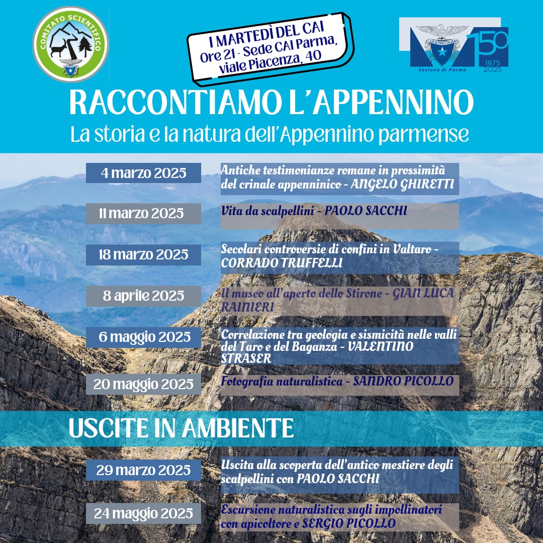 Per celebrare il 150° anniversario della Sezione CAI di Parma, siamo lieti di presentare "Raccontiamo l'Appennino", un ciclo di incontri dedicati alla storia e alla natura dell'Appennino Parmense organizzati dal Comitato Scientifico della Sezione. Il programma prevede una serie di conferenze che si terranno il martedì sera alle ore 21 dal 4 marzo al 20 maggio presso la sede CAI di Parma in Viale Piacenza, 40.