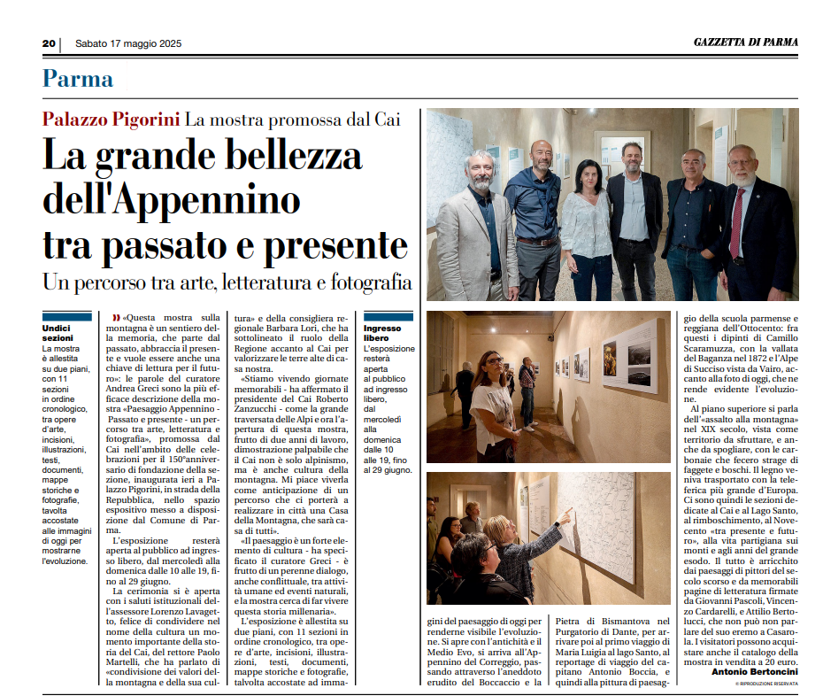 La Mostra "Paesaggio Appennino" curata da Andrea Greci nell'ambito delle iniziative per festeggiare i 150 anni dalla nascita della nostra Sezione e aperta al pubblico da sabato 17 maggio a Palazzo Pigorini (via Repubblica) con ingresso libero, é visitabile dalle 10 alle 19 dal mercoledì alla domenica fino al 29 giugno ed è corredata da un ricco catalogo (qui tutti i dettagli: Mostra_paesaggio_appennino ).