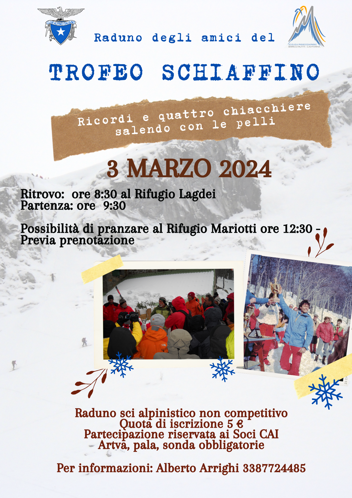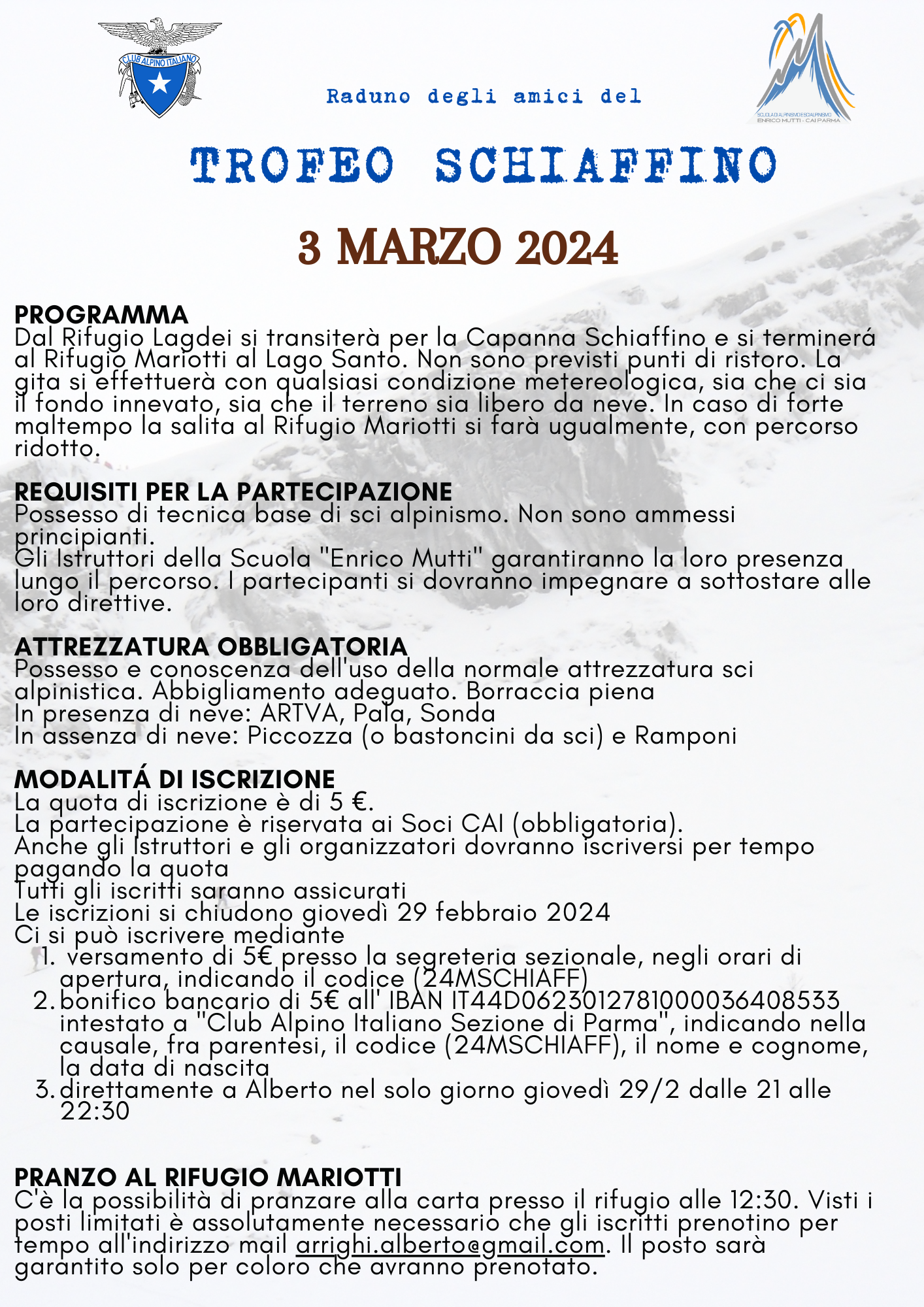 Per rivivere lo spirito dello storico TROFEO SCHIAFFINO la Scuola "Enrico Mutti" organizza un raduno sci alpinistico non competitivo. Una giornata da passare insieme, "vecchi" e giovani, tra chiacchiere e ricordi, seguendo parzialmente lo storico percorso da Lagdei al Lago Santo passando per la Capanna Schiaffino. La gita si effettuerà con qualsiasi condizione metereologica, con o senza neve. Tutti i dettagli nella locandina e nel programma allegato.