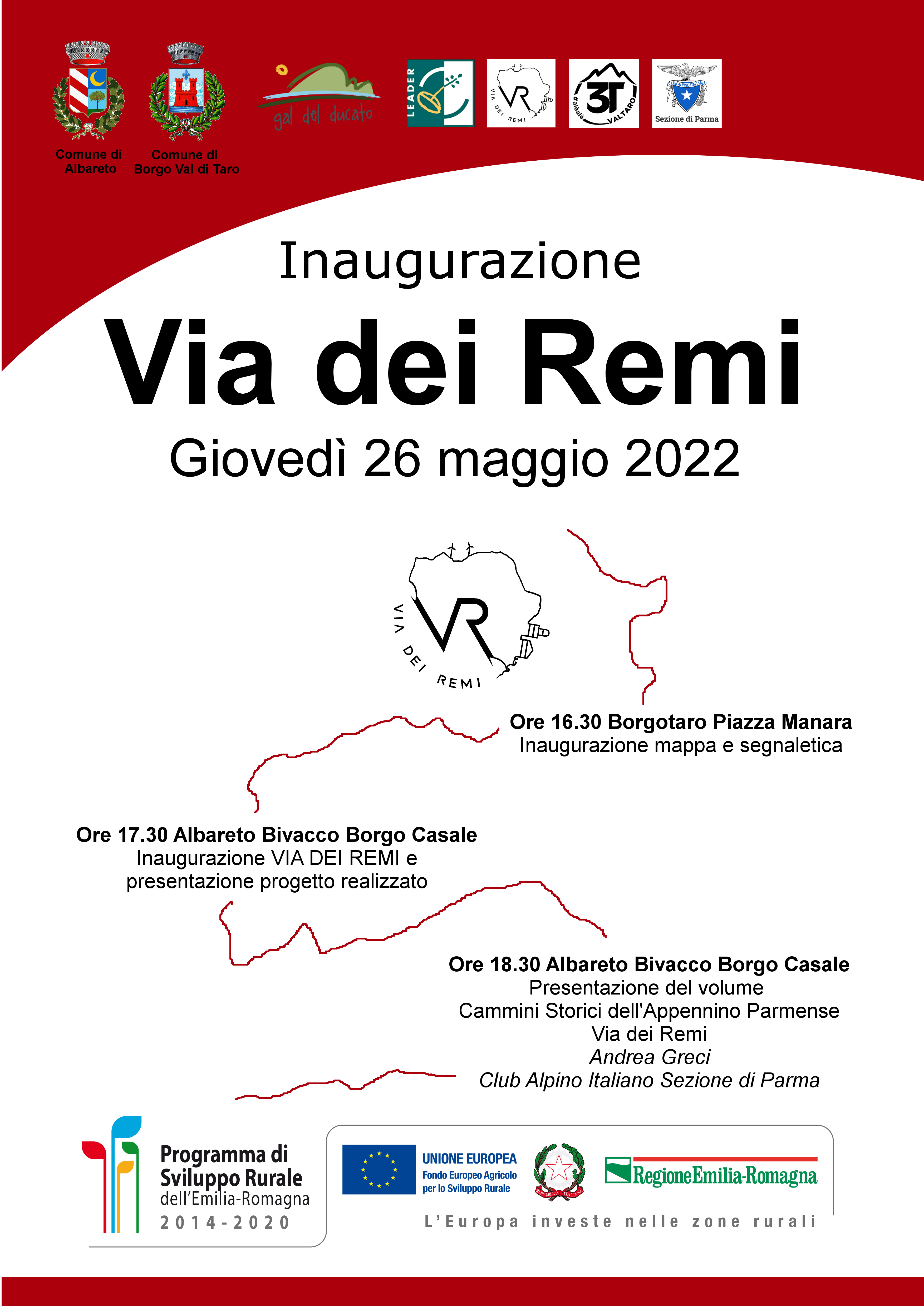 Giovedì 26 maggio alle 16,30 a Borgotaro inaugurazione ufficiale della Via dei Remi, a seguire inaugurazione del Bivacco Borgo Casale ad Albareto con successiva presentazione del Volume sulla Via dei Remi scritto da Andrea Greci per la collana dei Cammini storici dell'Appennino Parmense. I dettagli nella locandina allegata.
