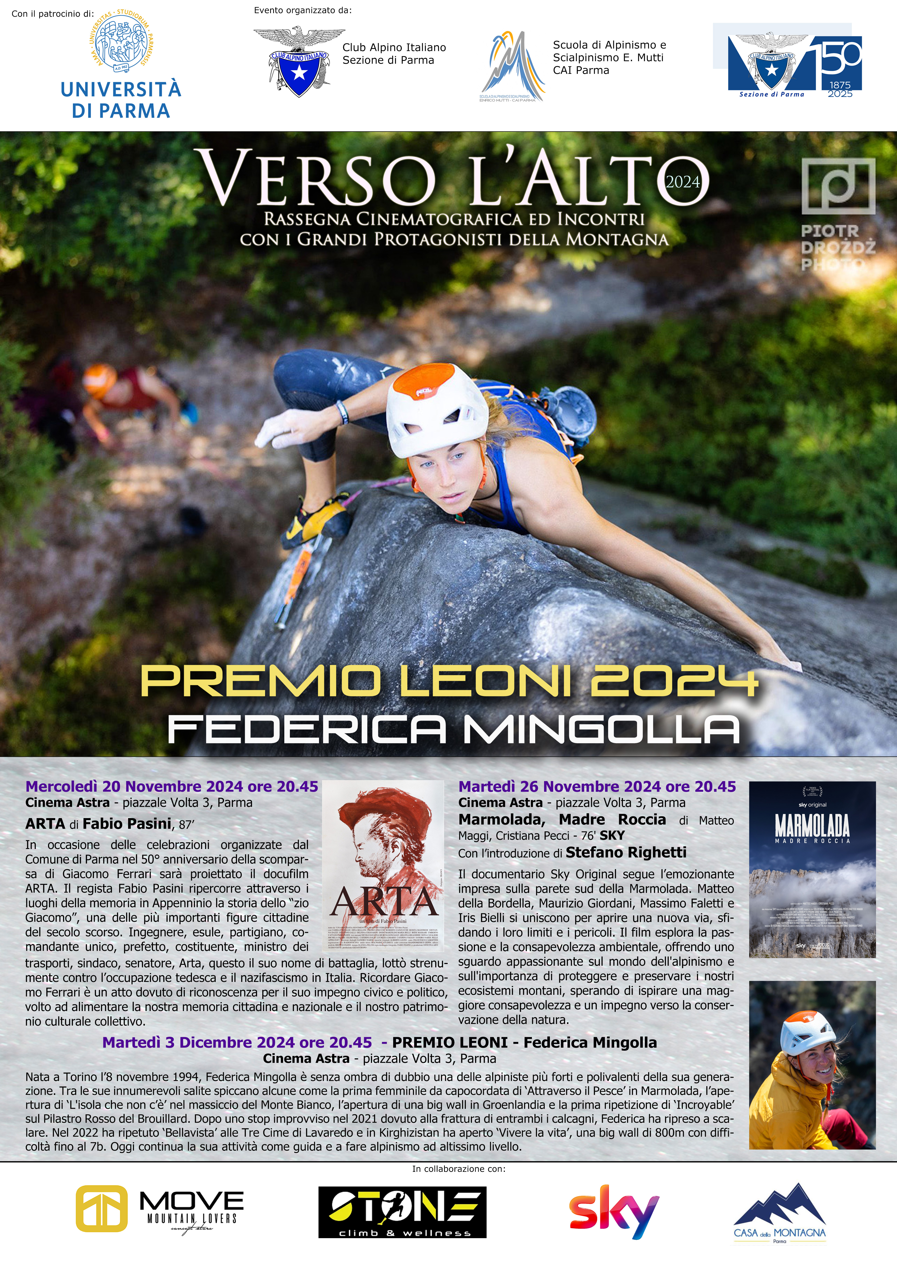 Mercoledì prossimo 20 novembre ore 20.45 inizia la rassegna Verso l’Alto 2024 organizzata dal Club Alpino Italiano Sezione di Parma. Rassegna dalla tradizione ormai consolidata, quest’anno si svolge in tre serate presso il cinema Astra con film e incontri legati al mondo della montagna.