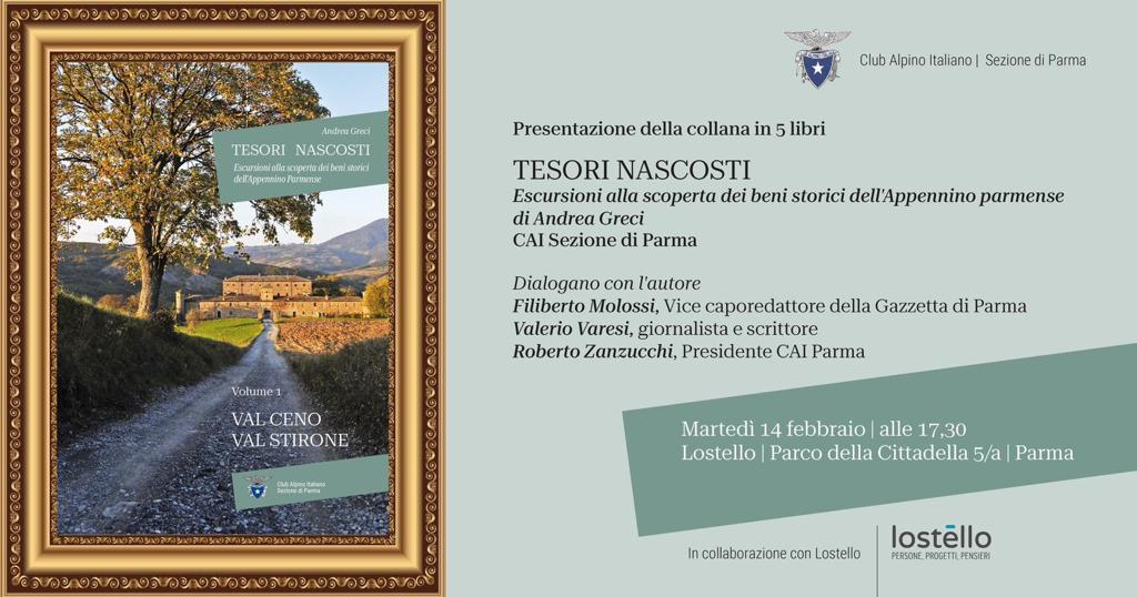 La collana “Tesori nascosti: escursioni alla scoperta dei beni storici dell’Appennino parmense”, edita da CAI Parma e distribuita con la Gazzetta di Parma, verrà presentata martedì 14 febbraio alle ore 17,30 a Lostello in Cittadella. Interverranno l’autore Andrea Greci, Valerio Varesi, giornalista, scrittore, appassionato di natura e montagna, Sabrina Schianchi, responsabile marketing della Gazzetta e Roberto Zanzucchi, presidente del CAI Parma. Modererà l’incontro Filiberto Molossi, vice caporedattore della Gazzetta di Parma.