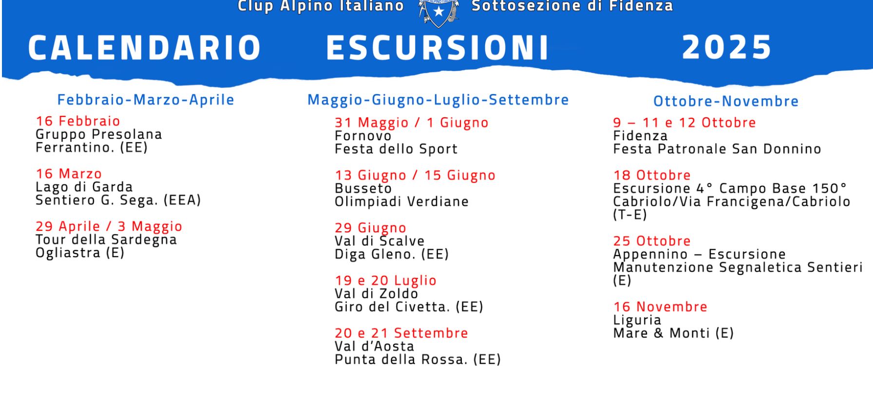 In allegato, con un solo colpo d'occhio, le attività programmate per tutto l'anno dalla Sottosezione di Fidenza